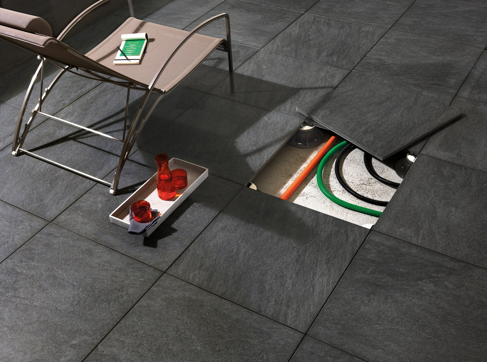Terasy a balkóny - realizace balkónů a teras klasickým lepením 9-10 mm silných dlažeb přináší po několika letech mnoho problémů. Díky velkému rozdílu teplot mezi jednotlivými ročními obdobími docházelo k popraskání spár a utržení dlažeb od podkladu. Dlažby silné 2 cm umožňují jinou technologii montáže. Na balkónech je možné pokládat dlažbu jen na gumové podložky. U větších teras, kde máte sklon a chcete, aby byla dlažba v rovině, se používají stavitelné terče. Pod dlažbou můžete mít rozvody vody na zavlažování, odpad z vířivky na terase nebo elektrické kabely. Na terasách je možné udělat kvalitní izolaci, kterou dlažba chrání proti mechanickému poškození, UV záření a je kdykoliv přístupná ke kontrole nebo případné opravě.