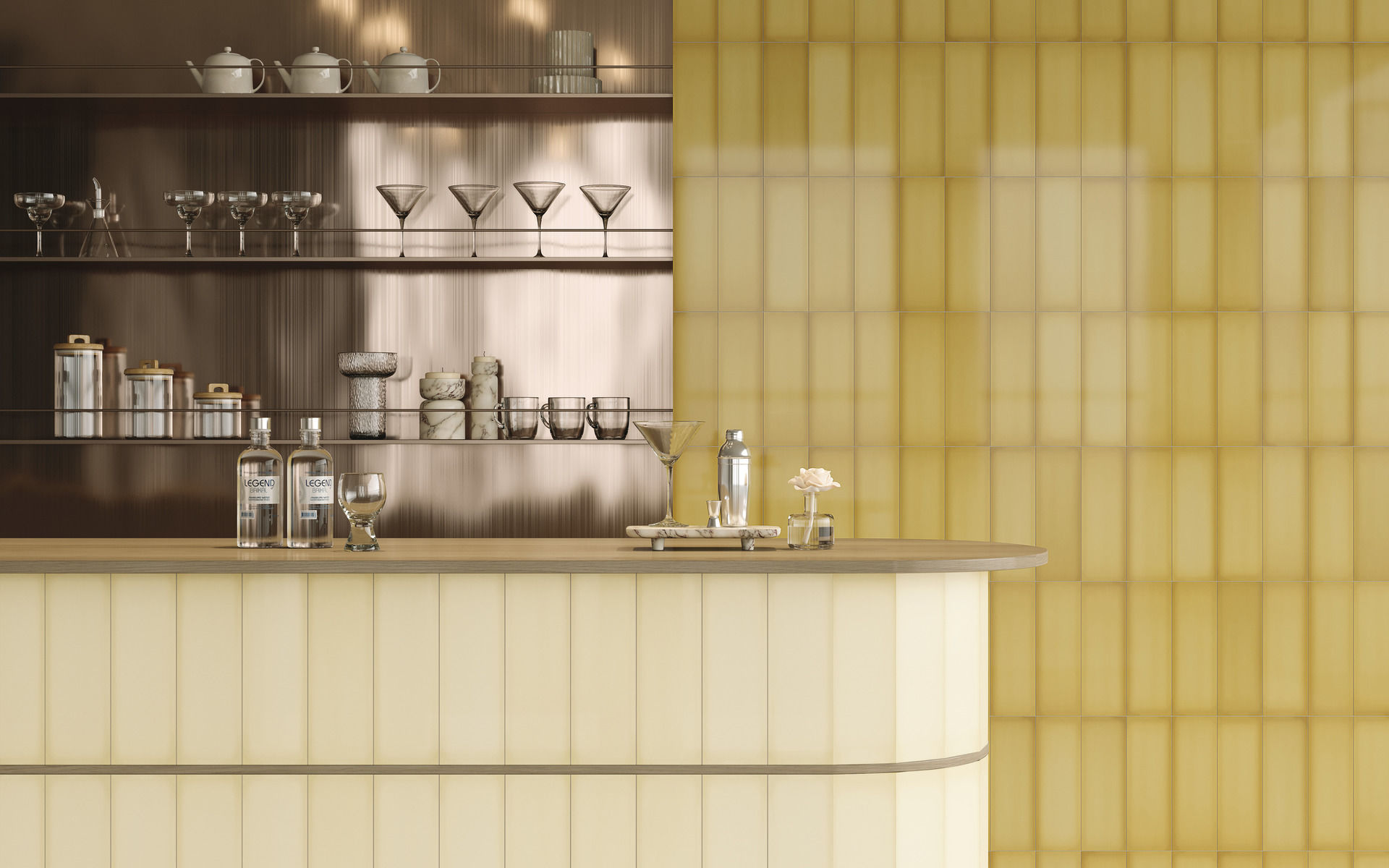 Na přiložených obrázcích je kavárna s keramickým obkladem na stěnách Slide, kde se zkombinovaly neutrální designy white a grey.