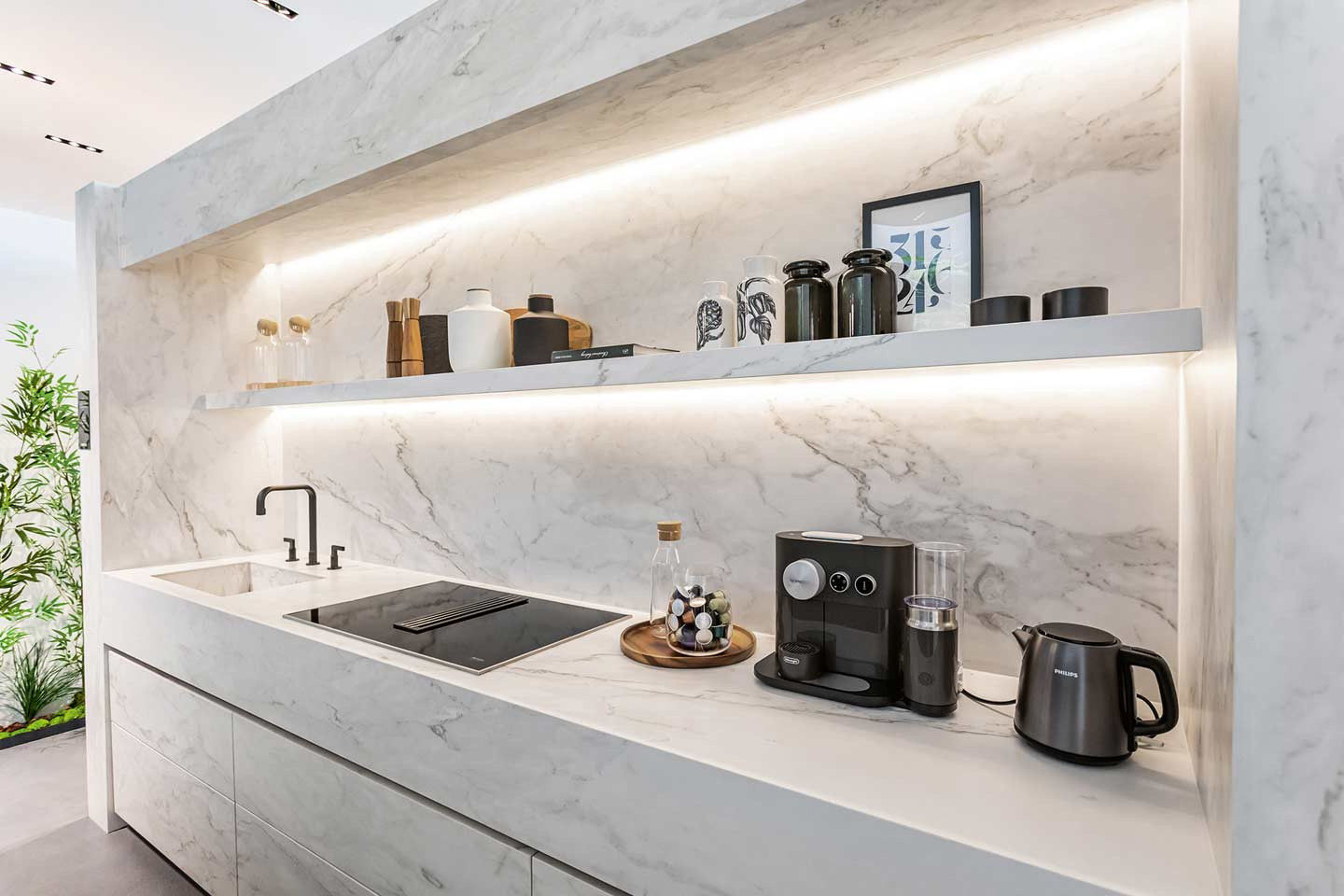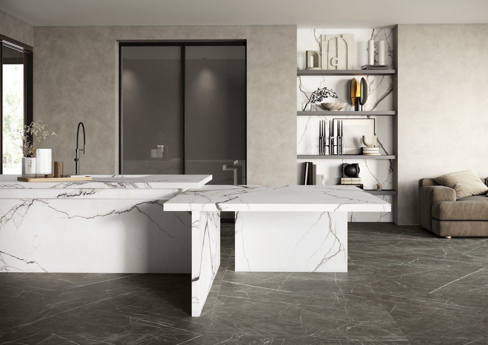 Kuchyně s obkladem a dlažbou v designu mramoru působí nadčasově a elegantně. Mramorový design dodává prostoru lehkost a luxus. Velkoformátové obklady navíc minimalizují množství spár a nechávají tak vyniknout kresbu samotného materiálu. Přední italský výrobce Florim nabízí hned několik sérií imitující tento přírodní materiál, které spojuje věrohodný vzhled s vysokou odolností a praktičností pro každodenní provoz kuchyně.