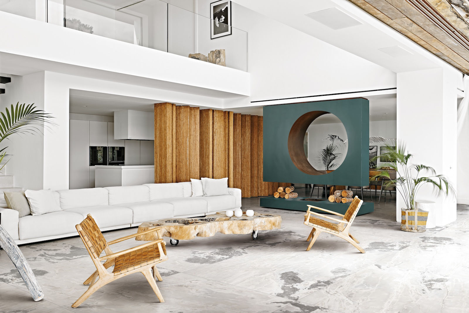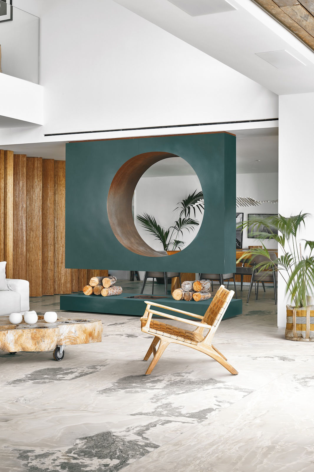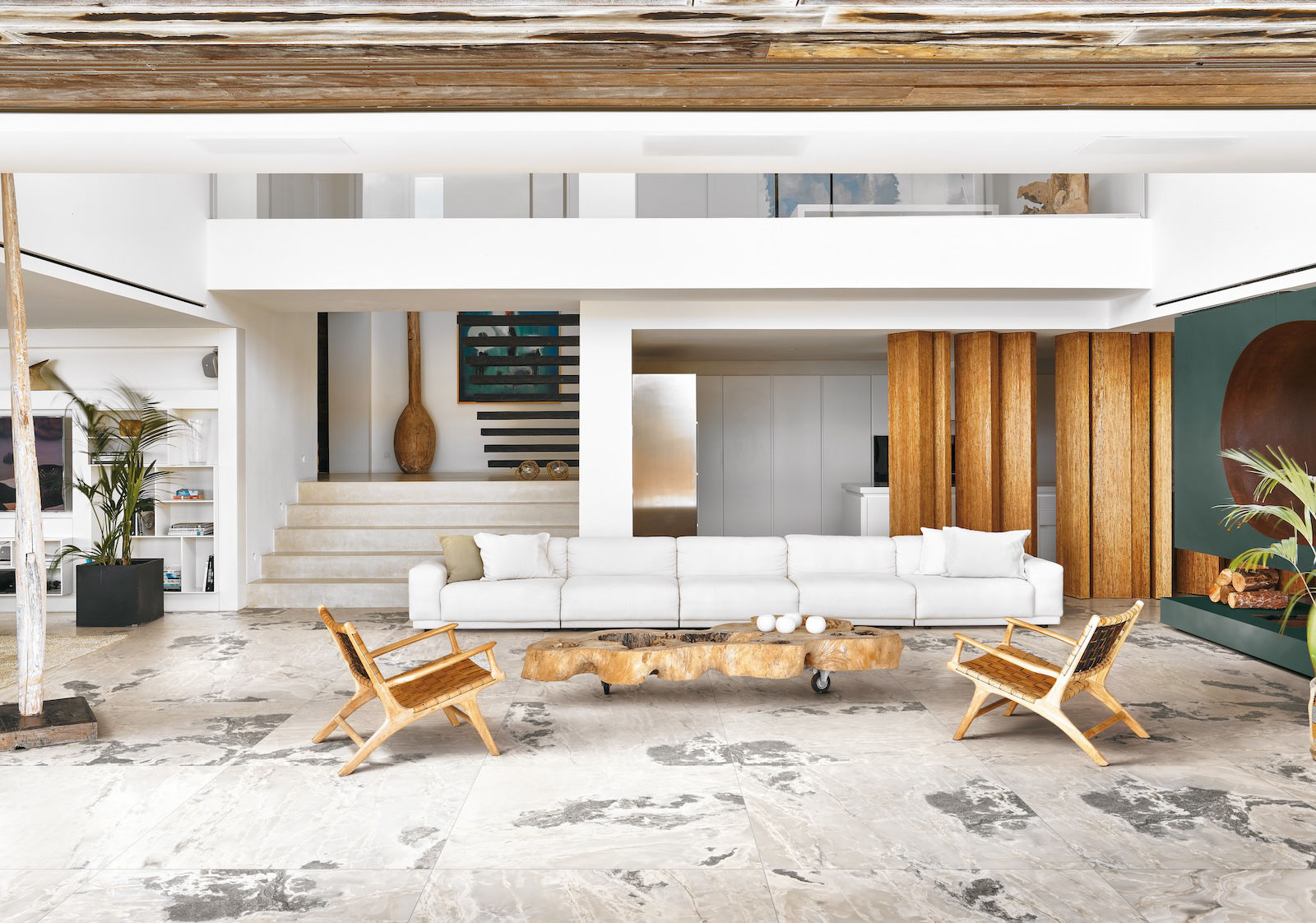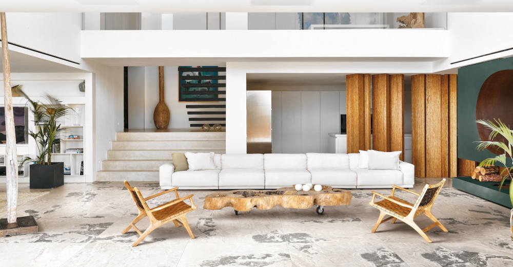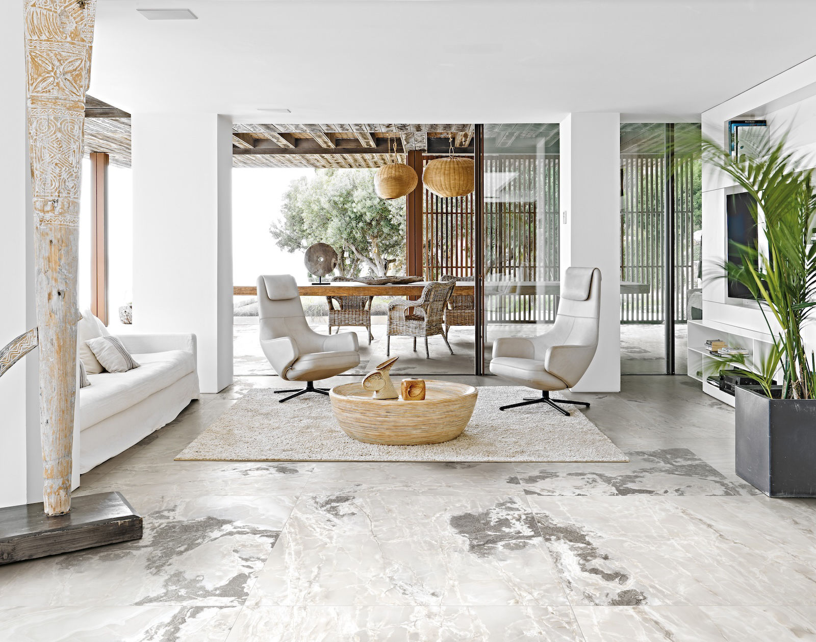 Na přiložených obrázcích v obývacím pokoji si můžete na podlaze prohlédnout keramickou dlažbu v designu White Blend.
